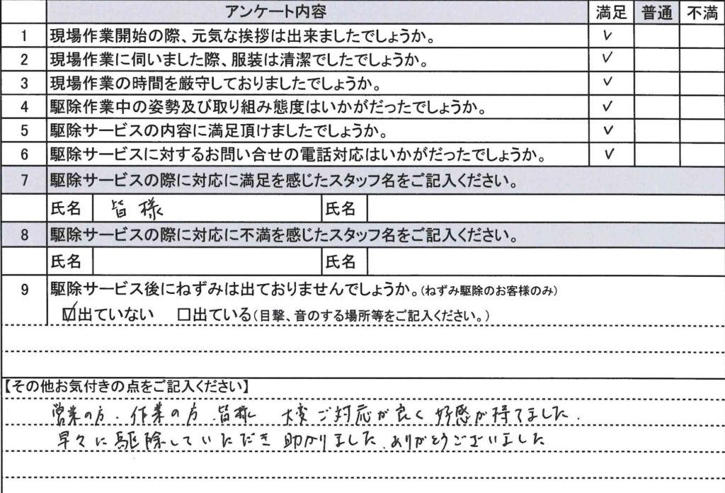 早々に駆除していただき助かりました。